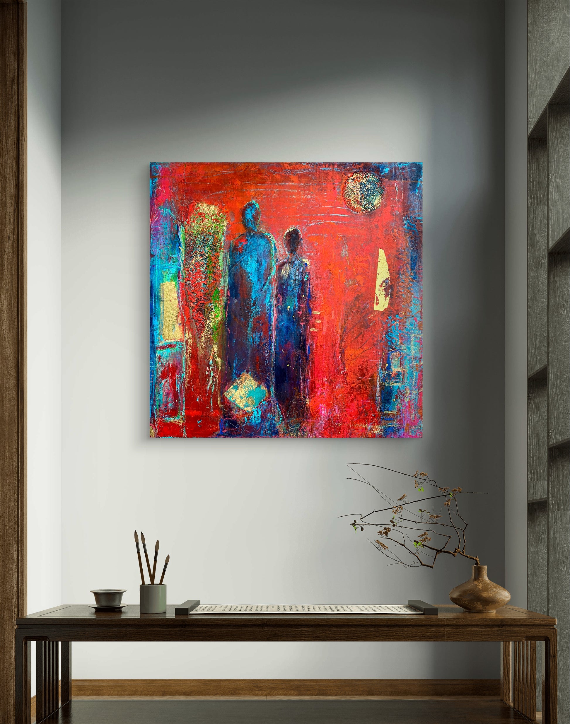 Unique painting created with acrylics, oil pastels, charcoal and gold details on stretched canvas.