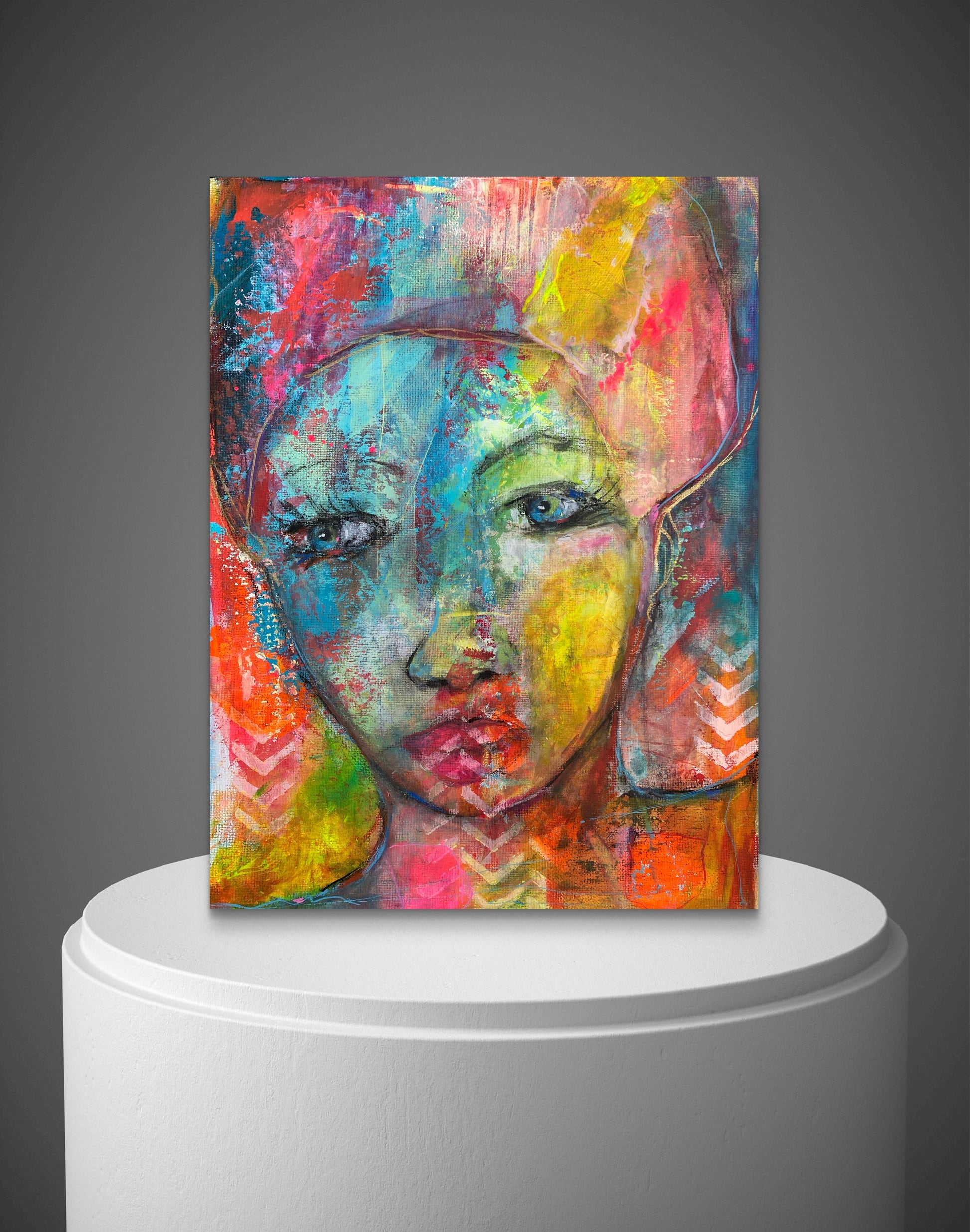 Unique painting created with acrylics, oil pastels, charcoal and gold details on CANVAS PANEL