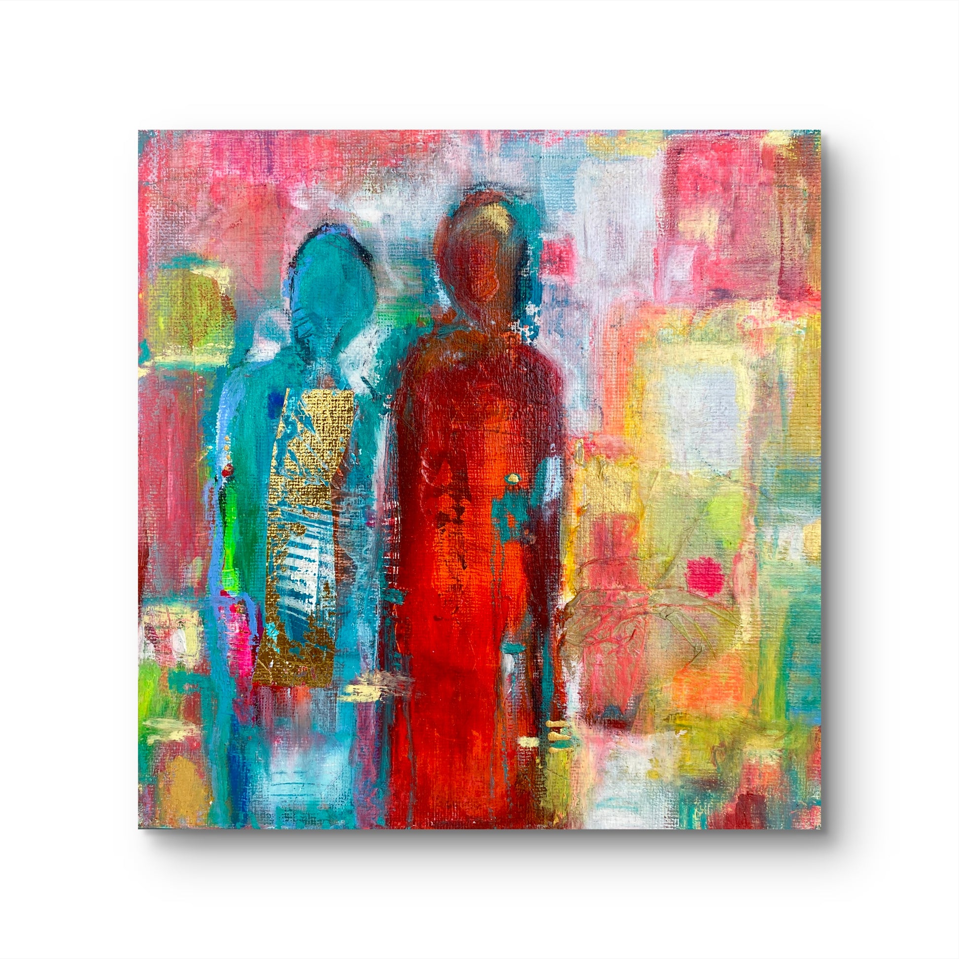 Unique painting created with acrylics, oil pastels and gold details on canvas panel.
