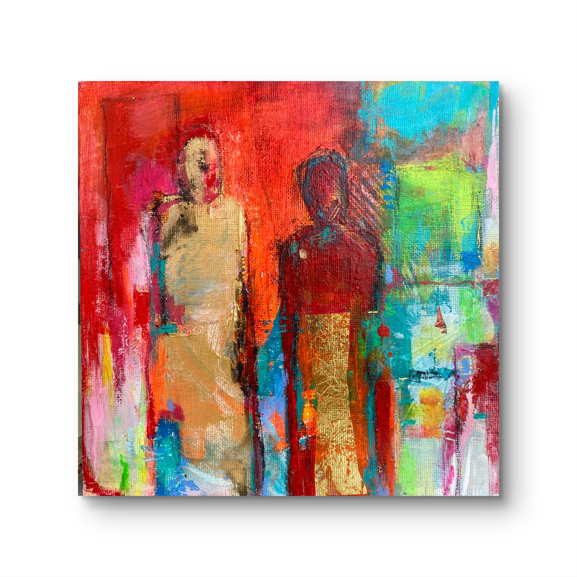 Unique painting created with acrylics, oil pastels and gold details on canvas panel.