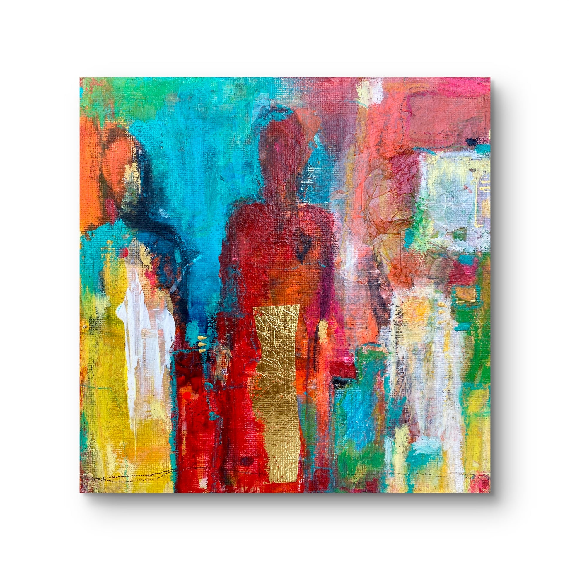 Unique painting created with acrylics, oil pastels and gold details on canvas panel.