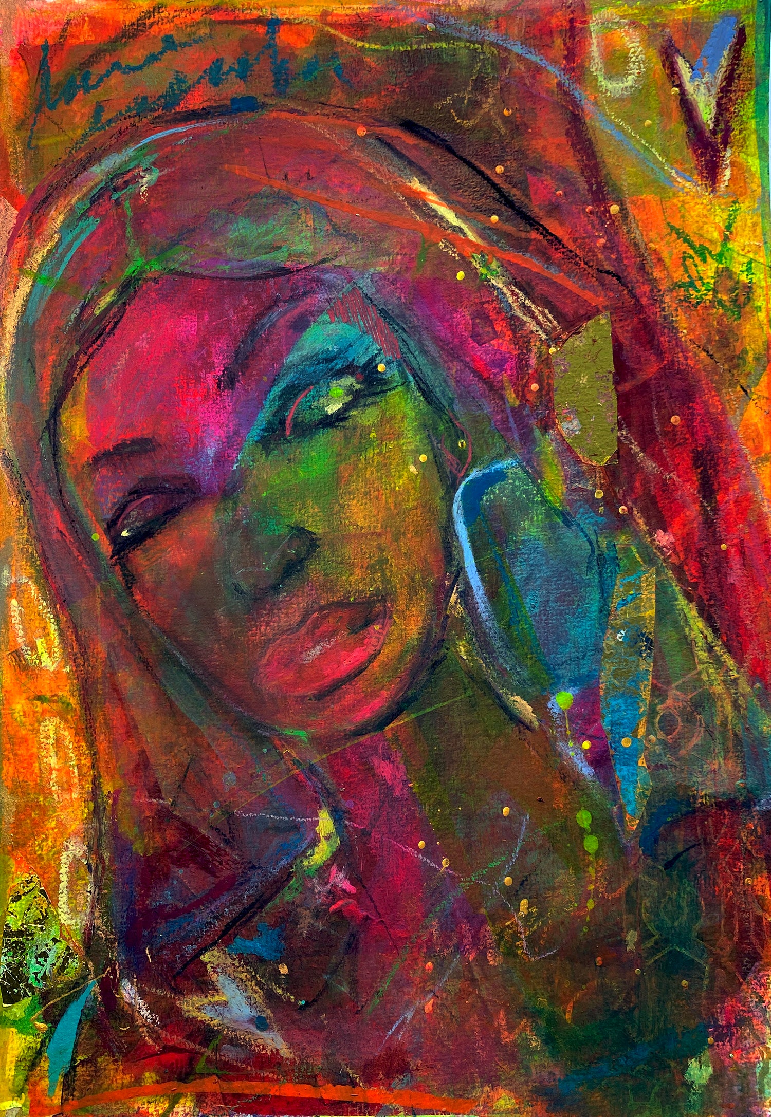 Unique painting created with acrylics on paper with gold details. A layer of protective varnish is added on the top.